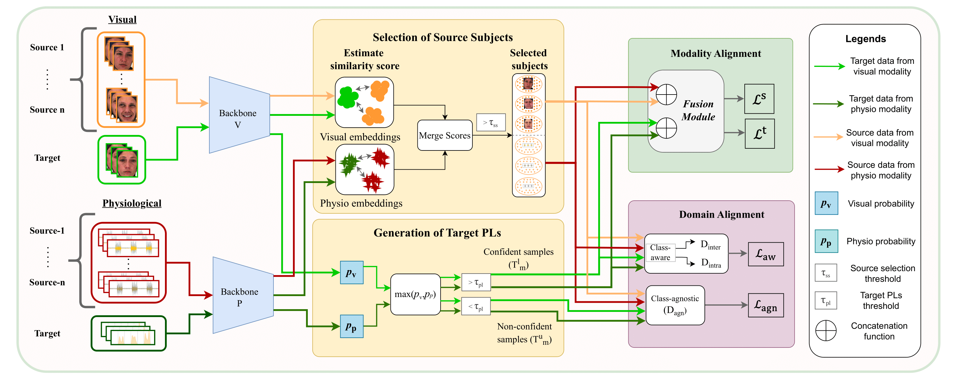 Modality Alignment: Features from different modalities are concatenated for each selected source and confident target subject, then processed through a fusion module.